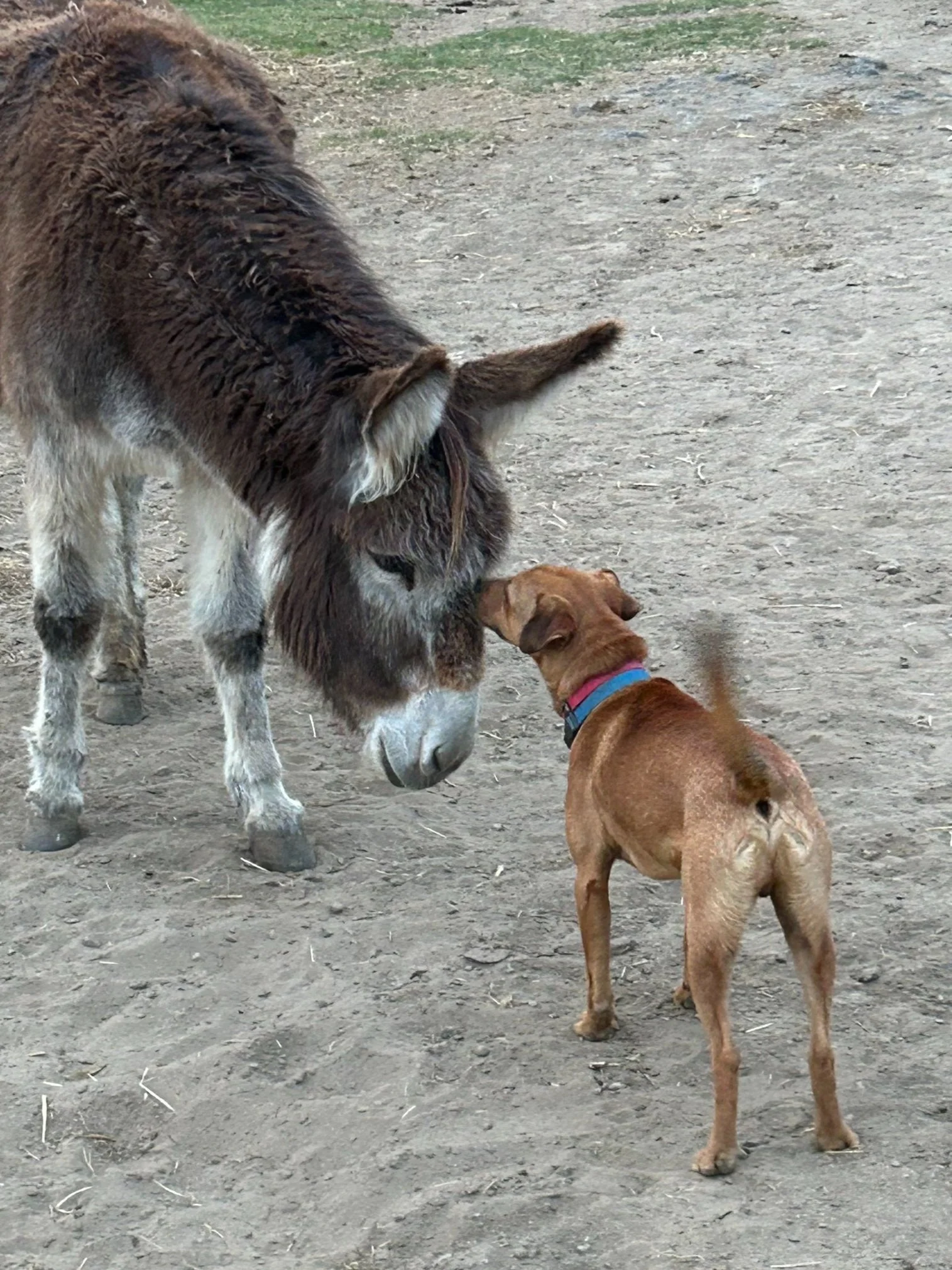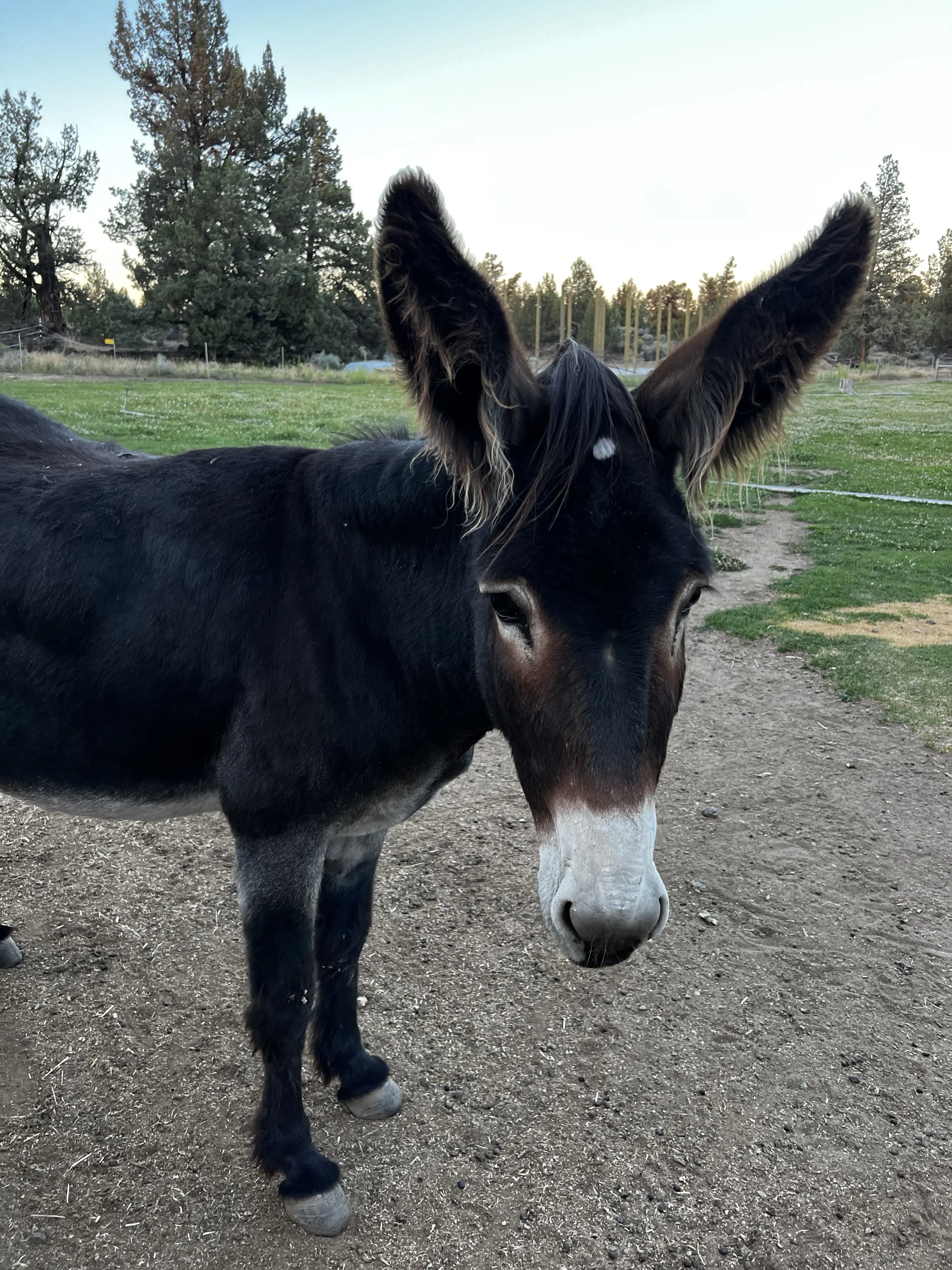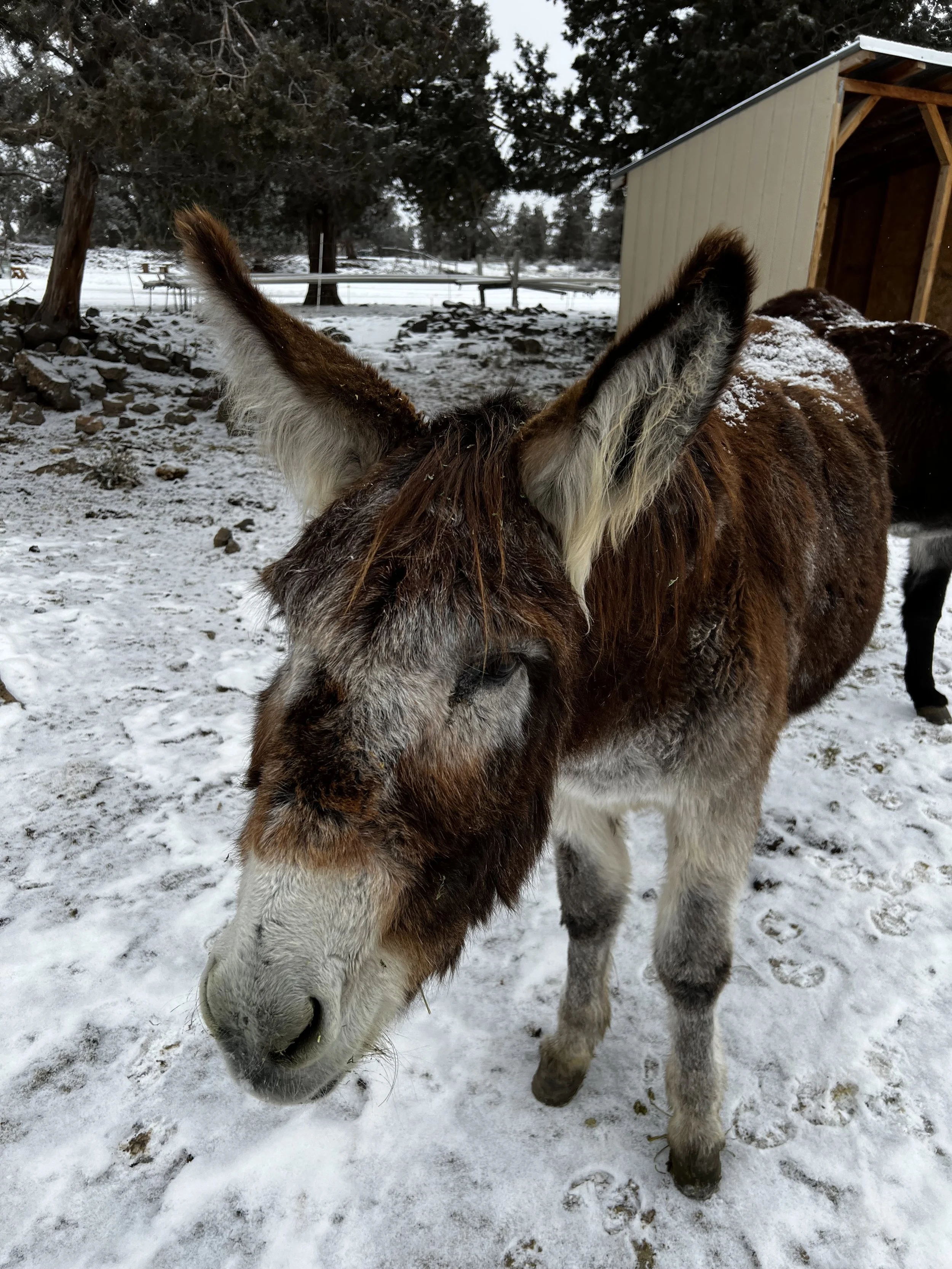 Belle is a 15 year old BLM donkey who keeps the predators at bay with her partner and daughter, Alice. She isn’t a huge fan of strangers, but takes her job as guardian very seriously and calls the shots with the cows and boy goats. She tolerates the dogs with a fair bit of grace that they don’t always deserve.